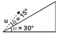 Solution: \begin{aligned} & \text { Time of flight }(T)=\frac{2 u \sin \alpha}{g \cos \beta} \\ & T=\frac{(2)(2 \sin 15)}{g \cos 30}=\frac{4 \sin 15}{10 \cos 30} \\ & \text { Range }(R)=(2 \cos 15) \mathrm{T}-\frac{1}{2} g \sin 30(\mathrm{~T})^2 \\ & = \\ & \text { (2 } \cos 15) \frac{4}{10} \frac{\sin 15}{\cos 30}-\left(\frac{1}{3} \times 10 \sin 30\right) \frac{16}{100} \frac{\sin ^2 15}{\cos ^2 30} \\ & =\frac{16 \sqrt{3}-16}{60} ; 0.1952 \mathrm{~m}=20 \mathrm{~cm} \end{aligned}