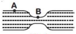 102. Water flows in a horizontal tube (see figure). The pressure of water changes by $700 \mathrm{Nm}^{-2}$ between $\mathrm{A}$ and $B$ where the area of cross section are $40 \mathrm{~cm}^2$ and $20 \mathrm{~cm}^2$, respectively. Find the rate of flow of water through the tube. (density of water $=1000 \mathrm{kgm}^{-3}$ )